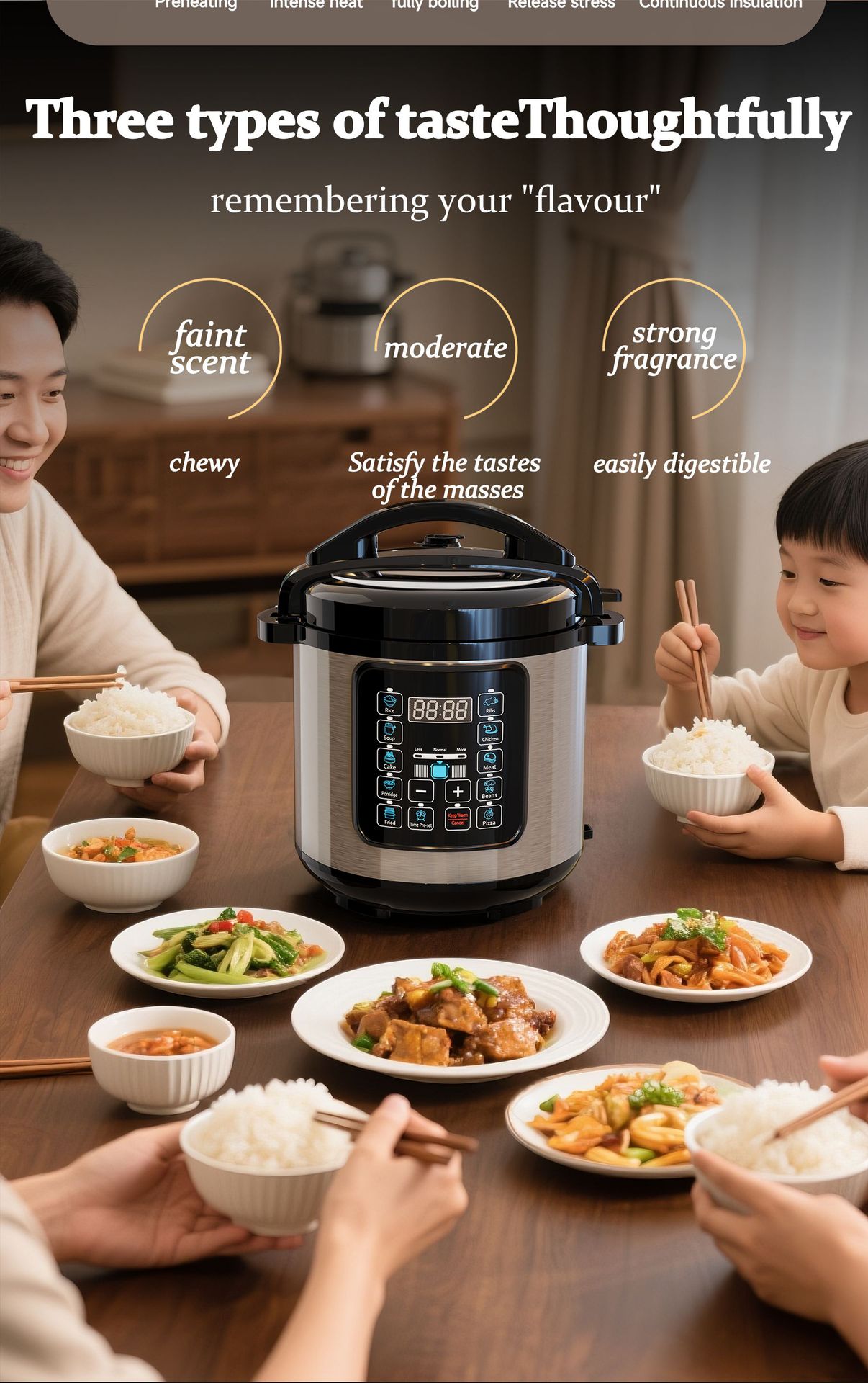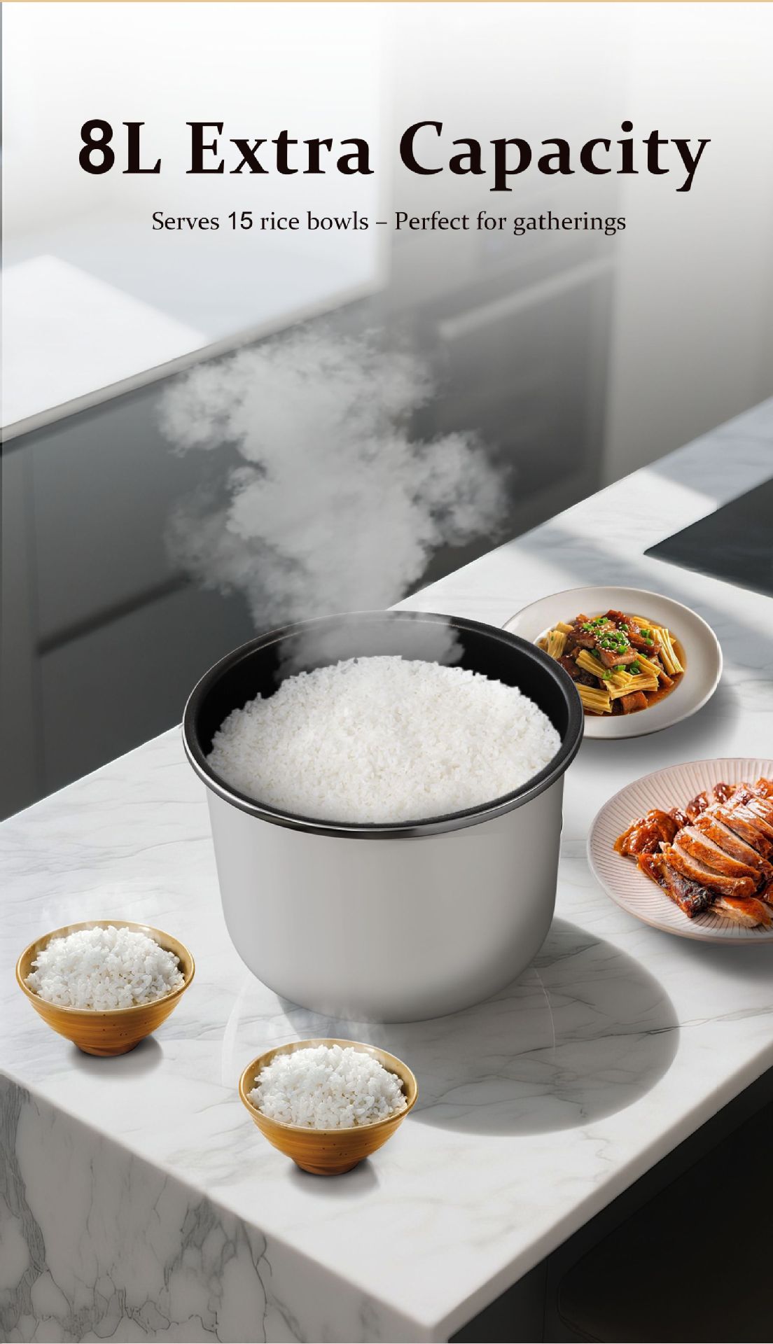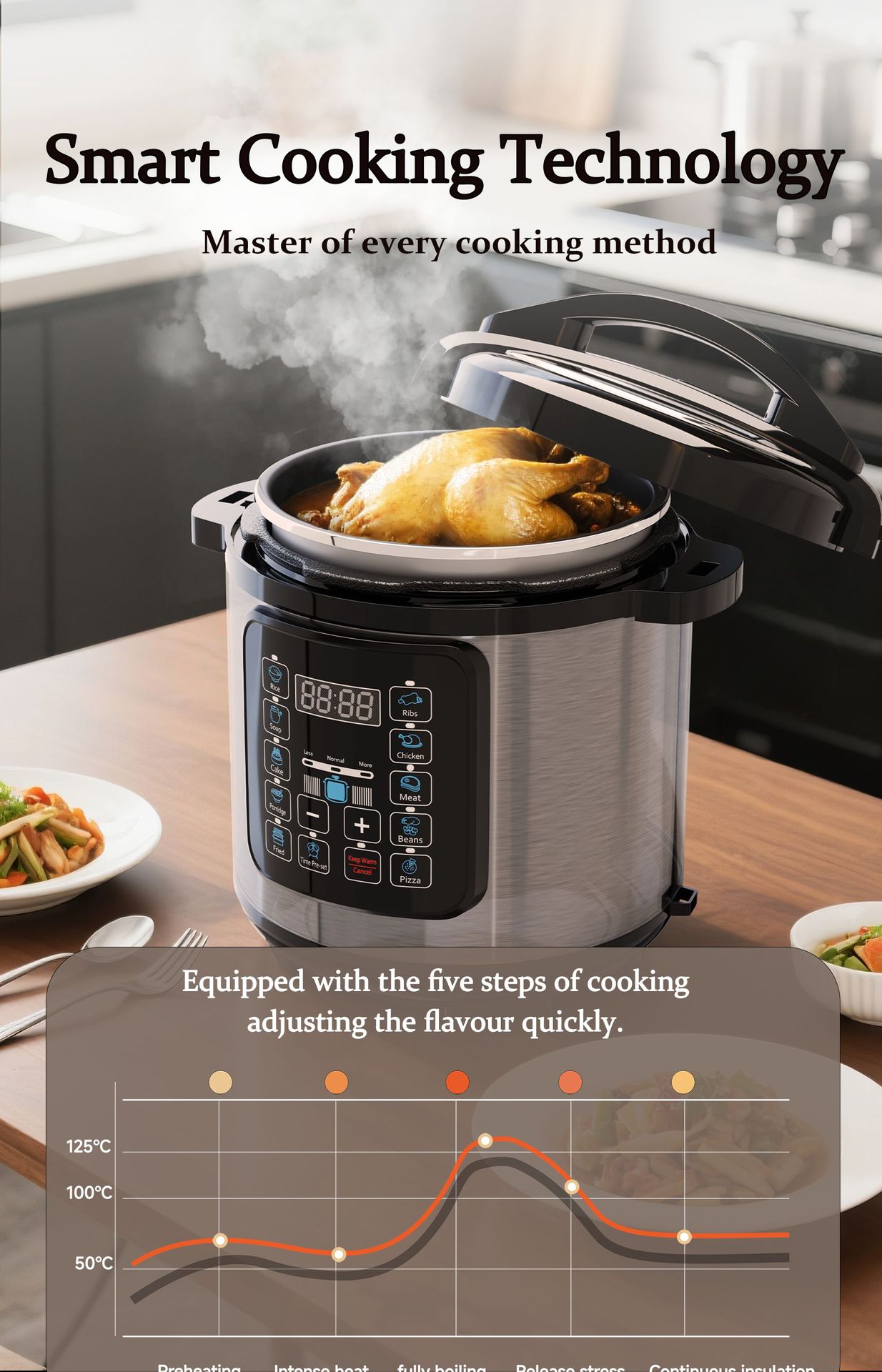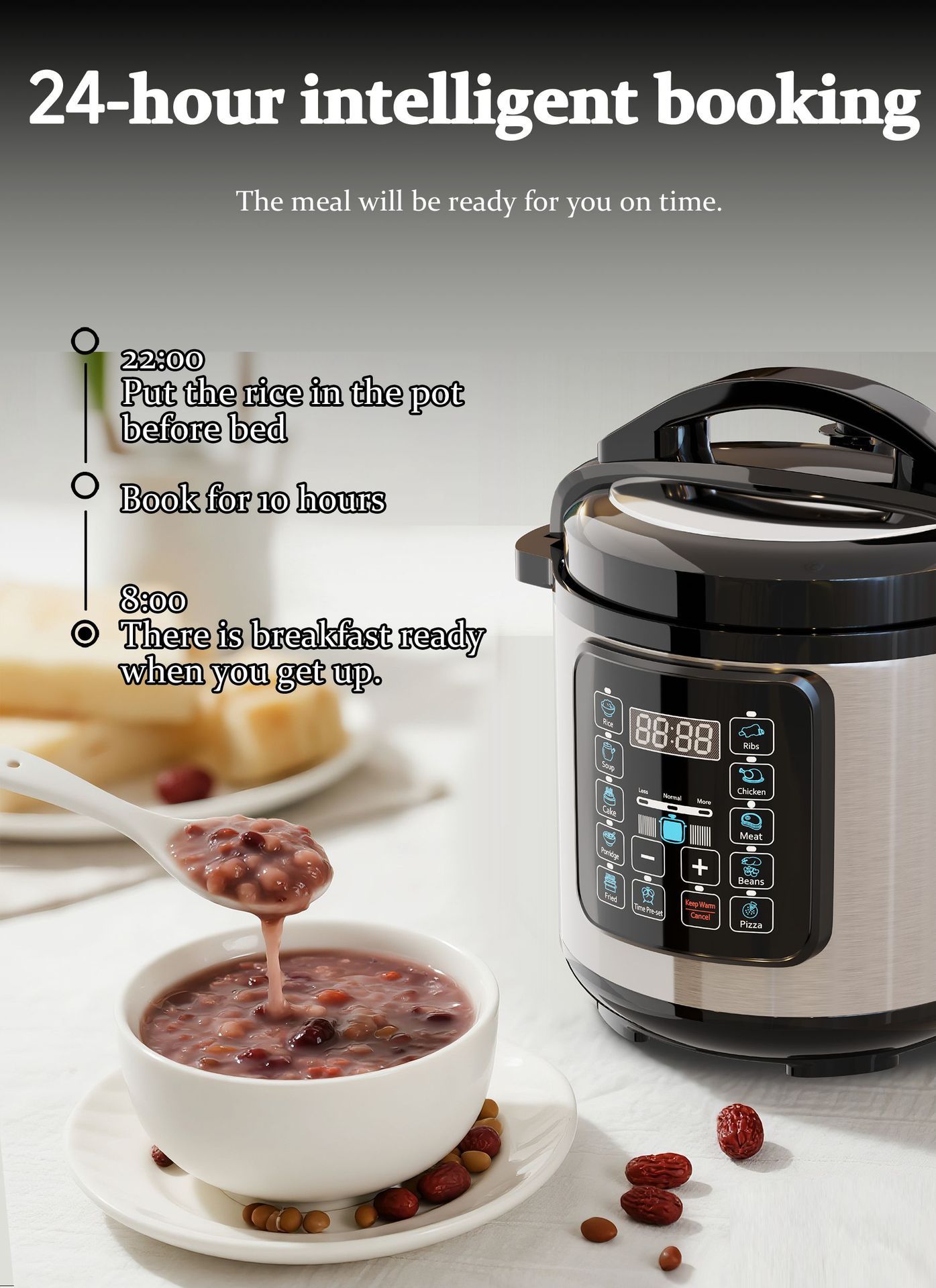 - 7 major functions: steaming, boiling, stewing, simmering, slow-cooking + timing + reservation